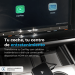 Además de su puerto HDMI, este adaptador te ofrece Apple CarPlay y Android Auto de manera inalámbrica. Para ello, tu carro debe contar obligatoriamente con CarPlay con cable instalado de fábrica. Simplemente conecta el adaptador al puerto USB/USB-C del auto y sincroniza tu iPhone o teléfono Android por Bluetooth. Así, accedes sin cables a aplicaciones de navegación, mensajería, llamadas y música directamente en la pantalla del auto.