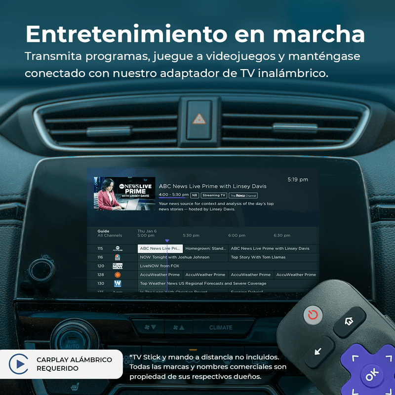 Te permite disfrutar de contenido multimedia o conectar accesorios como Chromecast, Roku, FireStick e incluso consolas de videojuegos en la pantalla de tu automóvil (o en pantallas adicionales que tengas instaladas). Gracias a esta funcionalidad, transformas tu vehículo en un auténtico centro de entretenimiento, ideal para viajes largos o momentos de espera.