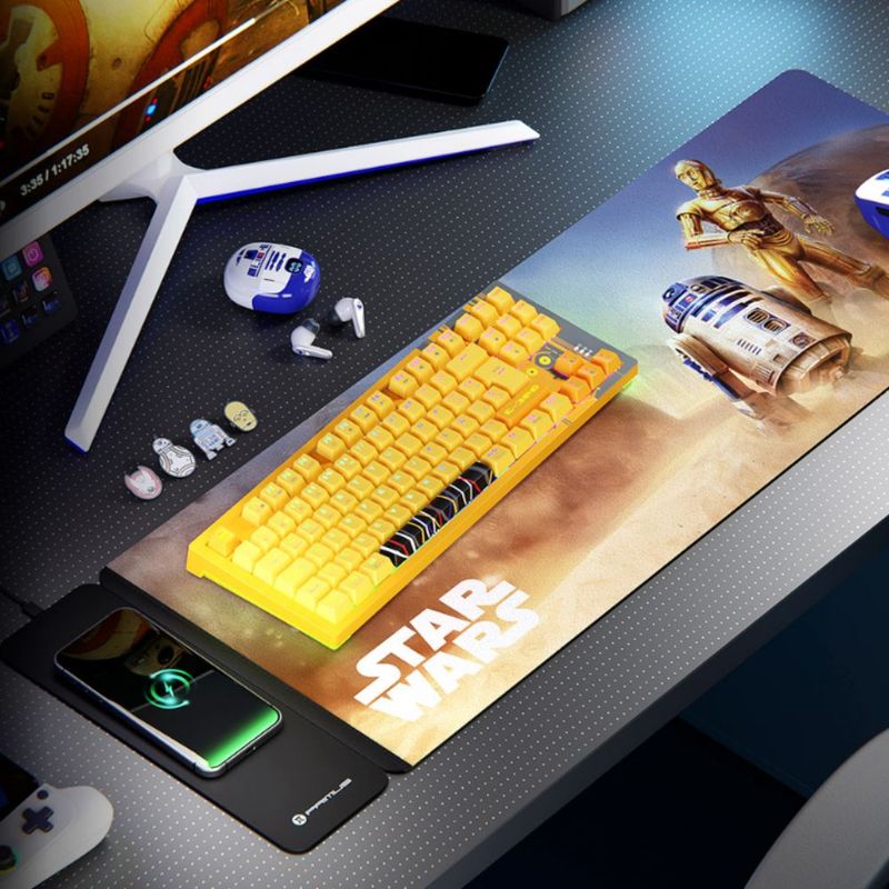 Alfombrilla tamaño XL diseñada para jugadores que buscan amplitud y fluidez. Su superficie optimizada garantiza un deslizamiento suave y precisión en sensores ópticos y láser. Incorpora cargador inalámbrico para mantener tu smartphone siempre activo mientras juegas. Diseño inspirado en droides de Star Wars.