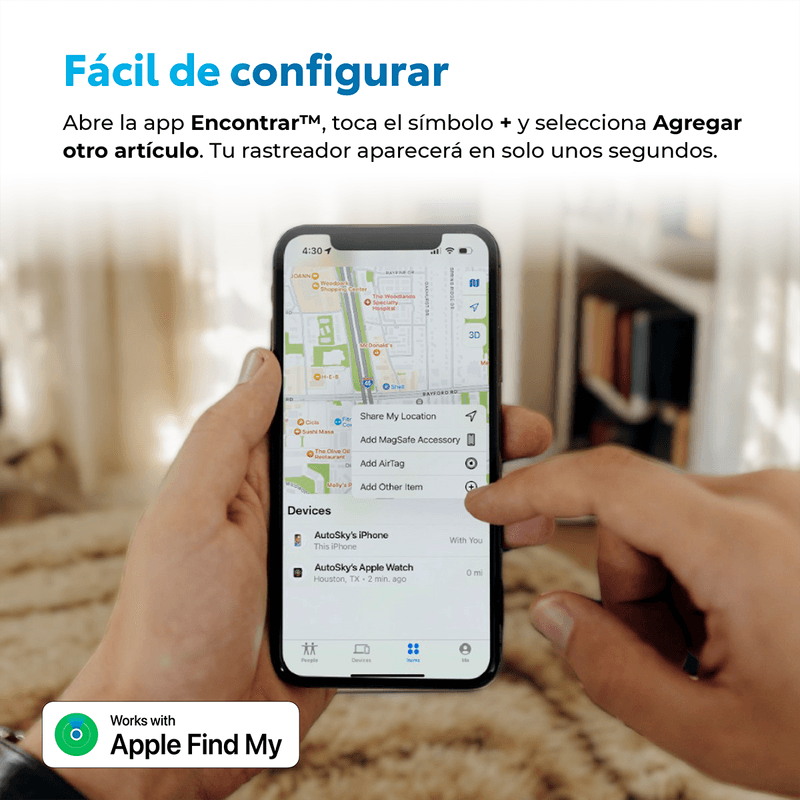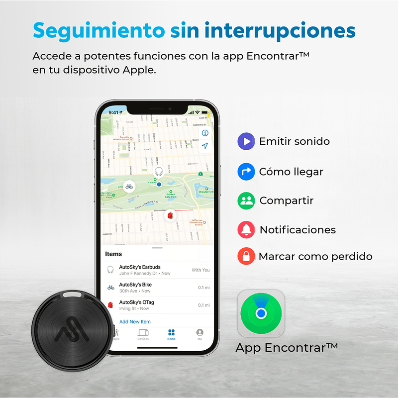 Rastreador Personal AutoSky (compatible con Apple Find My) — Funciona igual que un AirTag, pero con la calidad y respaldo AutoSky. Úsalo para llaves, billetera, mochila, equipaje o el collar de tu mascota (identificación) y localízalos desde tu iPhone con la app Buscar (Find My). Configuración en 1 minuto, sin suscripciones, alertas cuando lo dejas atrás, Modo Perdido y tono audible para encontrarlo cerca. Incluye 2 estuches protectores para fijarlo fácilmente y protegerlo del uso diario. Requisitos: iPhone/iPad/Mac con la app Buscar actualizada, Apple ID, Bluetooth y conexión a Internet para actualizar la ubicación. Importante: solo Apple (no Android). No es GPS en tiempo real; la ubicación depende de la Red Buscar de Apple (en zonas con pocos dispositivos Apple la actualización puede tardar).